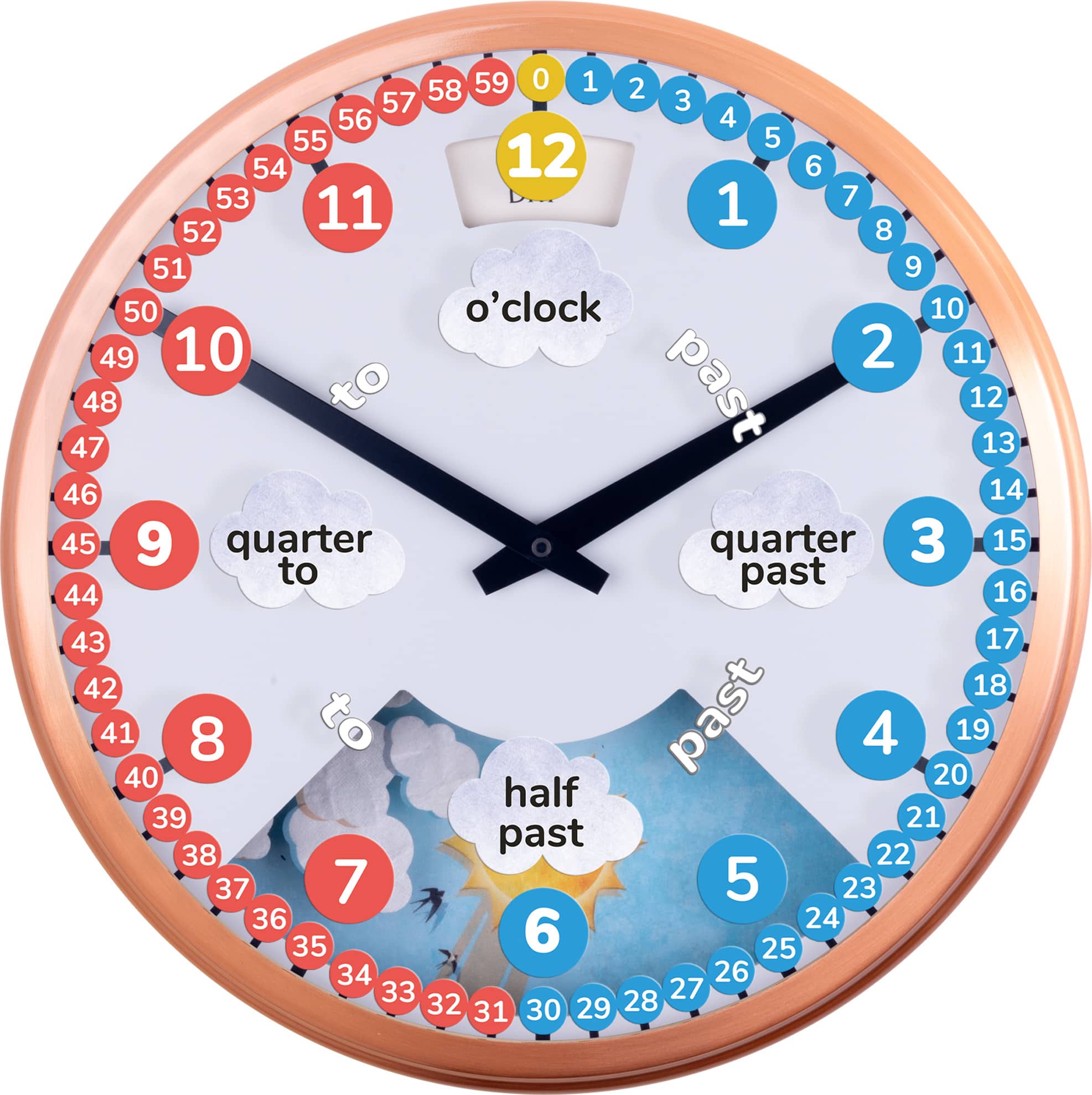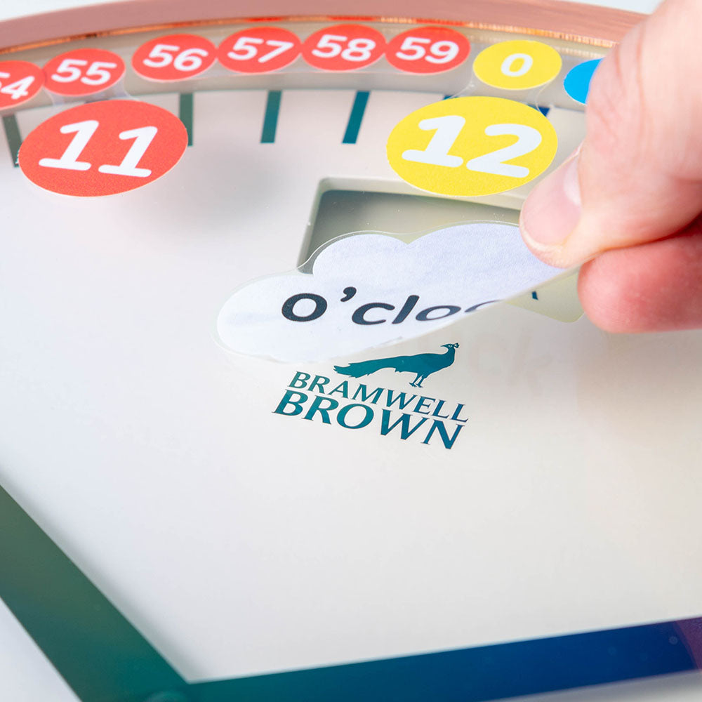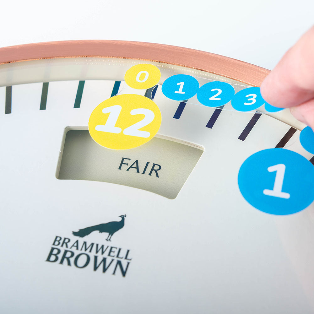 Whilst the Learn To Tell The Time graphics will stick to all Bramwell Brown Clock faces, the artwork comes in one size only. The above product photography shows the graphics on a Regular-sized (33cm / 13") Copper-framed Weather Clock.