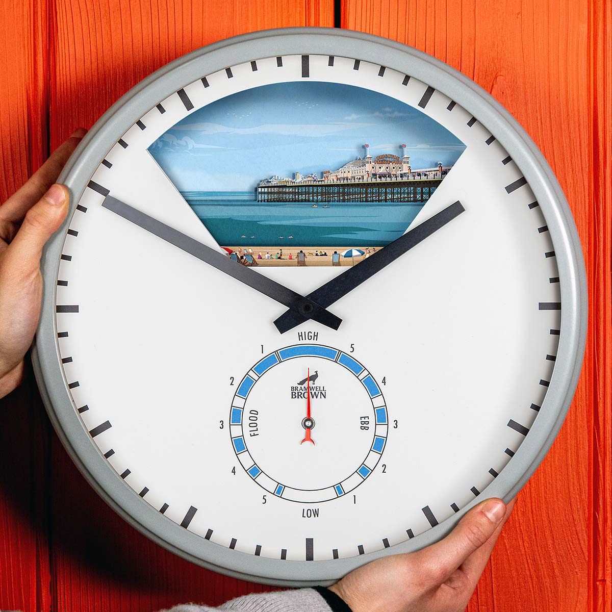 - Our Tide Clock collection could never be complete without featuring the Brighton seafront, famous for many things, including its pier, beach, arts and fun to be had; all of which we hope to have captured in this delightful timepiece.