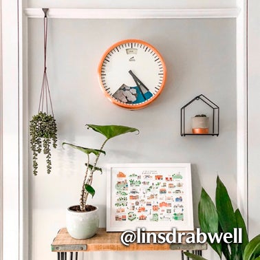 The steel clock frame is hand-finished. Copper-plated frames have a nice clear lacquer finish to prevent any oxidisation over time. German-made quartz mechanism keeps the clock hands on time without any ticking noise. Printed card clock face sits behind the anodised metal minute and hour hands. Weather artwork print is onto lightweight artboard and your bespoke planes printed onto custom-cut perspex. The clock window is shatterproof Lumex. -
