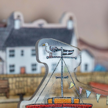 - A harbour scene in a tiny theatre set - the little mechanical scene shows a rising a falling tide in front of a harbour scene – based on several different Cornish towns. The greedy seagulls, colourful fishing boat and inquisitive harbour seal are all depicted, going up and down in front of the lovely townscape.