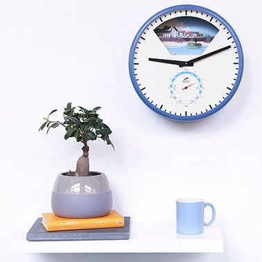 Steel clock frame is hand-finished. The Black, Grey or Blue coloured powder coats are silky smooth. Copper-plated frames have a nice clear lacquer finish to prevent any oxidisation over time. Printed card clock face sits behind the anodised metal minute and hour hands. The harbour artwork print is onto lightweight artboard. The clock window is shatterproof Lumex. -